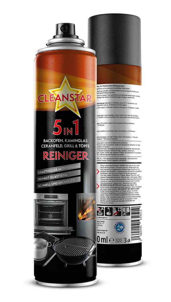 Kaltreinigung: Mit Cleanstar 5 in 1 einsprühen und 1–2 Stunden einwirken lassen. Backofen erst nach ca. 8 Stunden wieder benutzen.