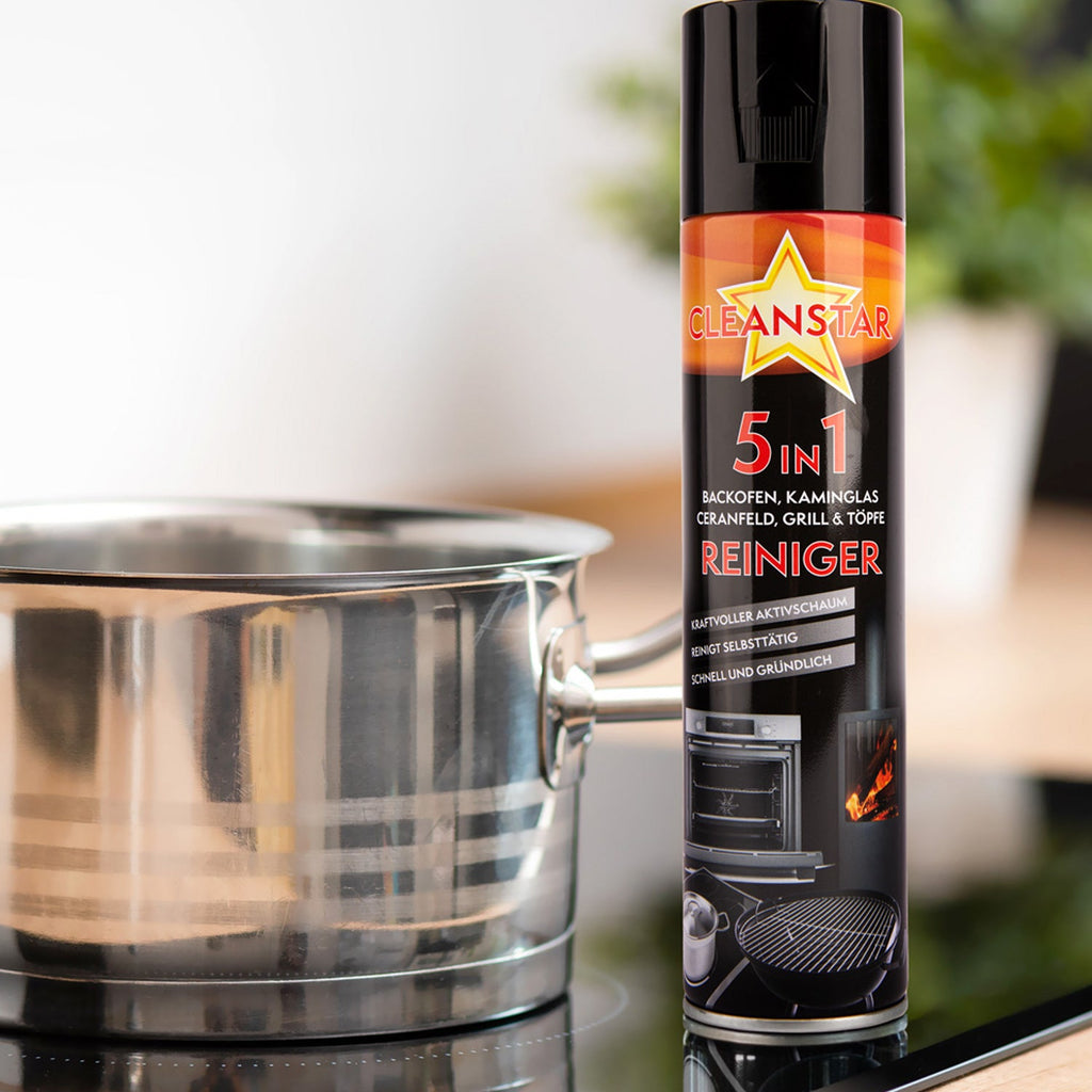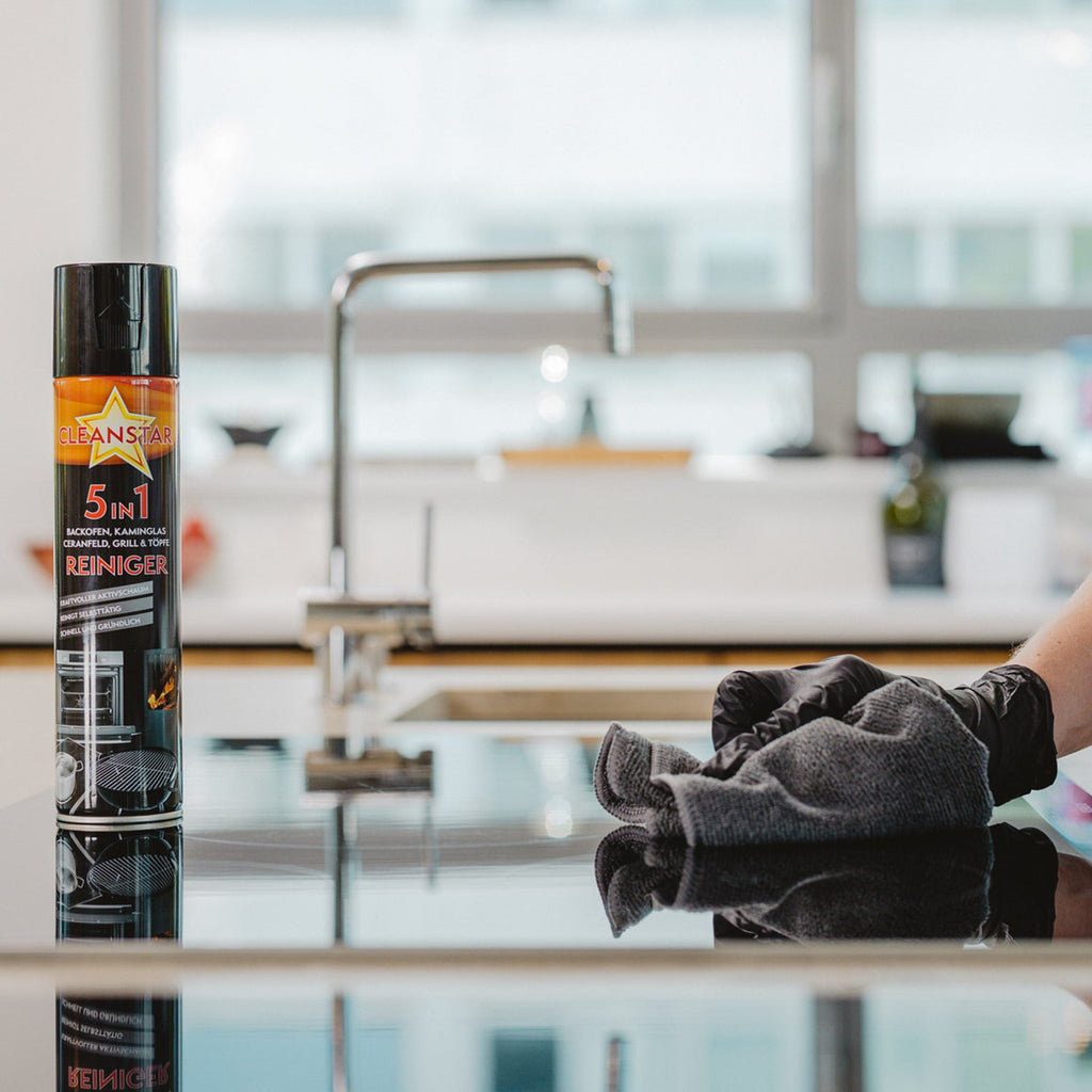 Starke Verschmutzungen vorab beseitigen. Spray auf ein Tuch oder die erkaltete Fläche sprühen. Danach mit einem feuchten Tuch nachwischen und trockenreiben.